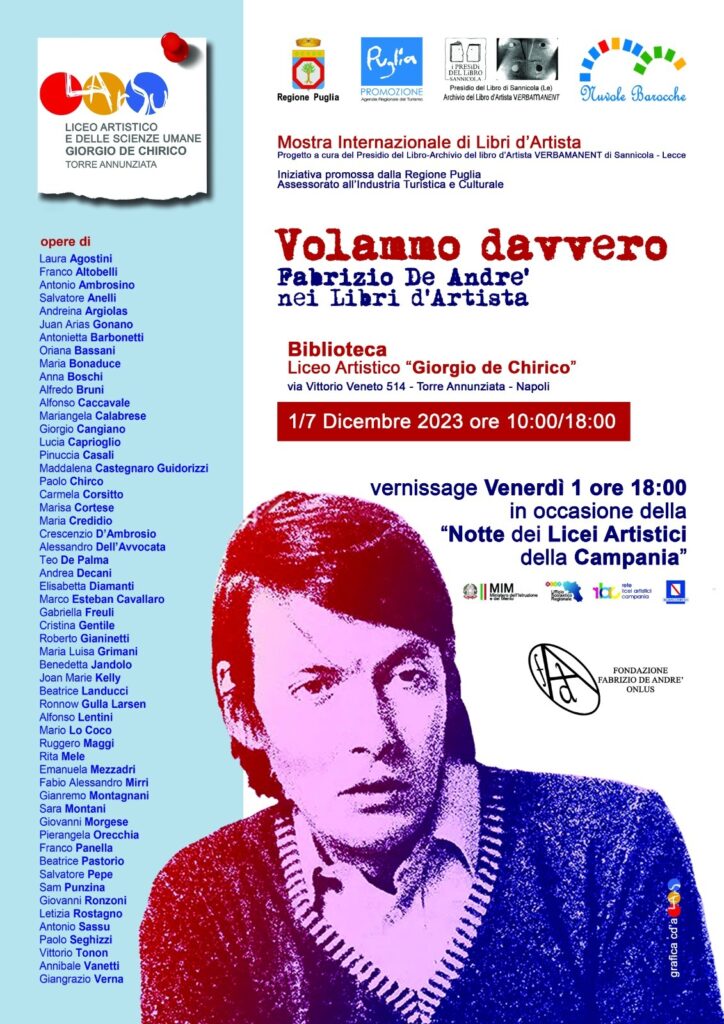 Dal 1 al 7 di dicembre si inaugura la manifestazione “Notte dei Licei Artistici della Campania”. Questa è un’ iniziativa promossa dalla Regione Puglia Assessorato all’ Industria Turistica e Culturale. La giornata inaugurale del 1° dicembre vedrà la presentazione del vernissage attraverso l’esposizione internazionale di Libri d’Artista, presso la sede del Liceo Artistico “Giorgio De Chirico” di Torre Annunziata.