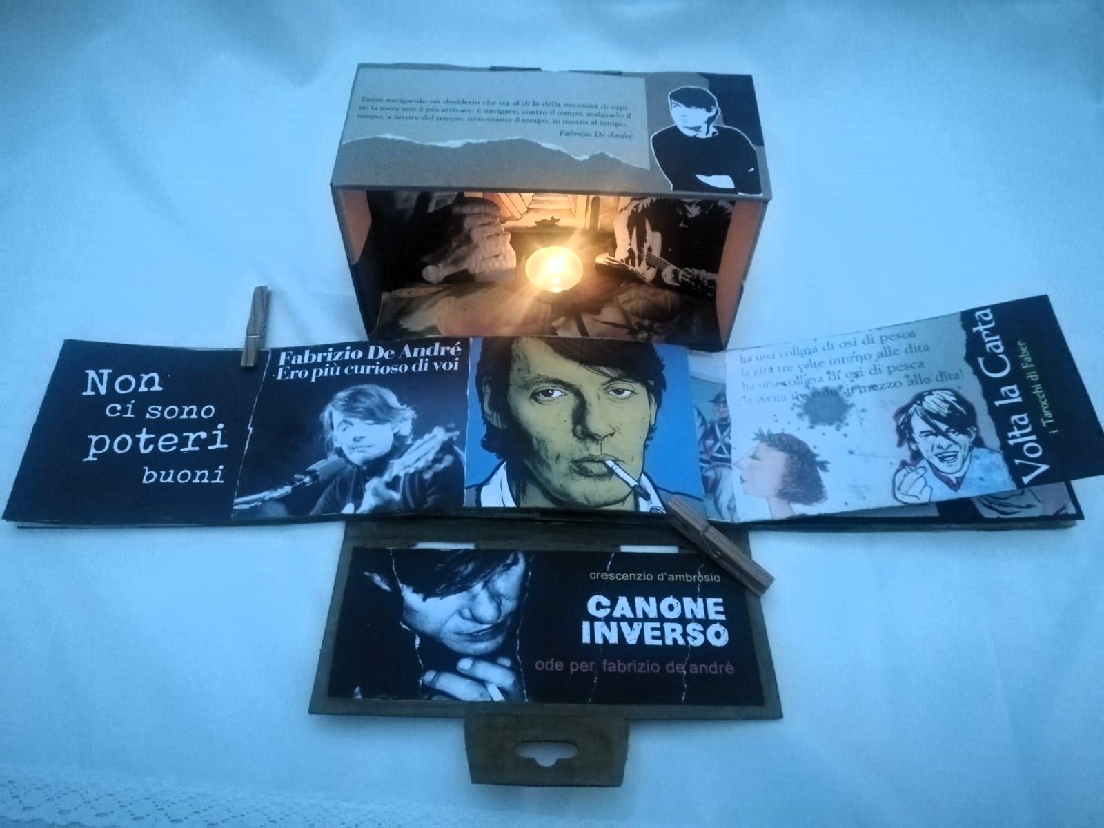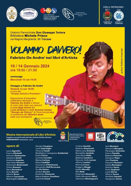 Continua il Tour Campano “Volammo davvero” dedicato a De Andrè, di cui ricorre il 25mo anno dalla sua scomparsa; ecco la locandina e la foto di uno dei libri in mostra, di Crescenzio D’Ambrosio. In questo periodo un po’ in tutta Italia si stanno organizzando iniziative su De Andrè. “Libro d’Artista, spiega il prof. Giorgio Cangiano, critico d’arte e autore anch’egli di una pubblicazione dedicata a De Andrè, è una modalità operativa di invenzioni formali e tecniche, frutto esemplificativo di esperienze multiple di artisti accomunati da un tema indicato, i quali in linea con l’evolversi delle rispettive soggettività stilistiche e funzioni differenti, esplicano il loro estro creativo, e la loro fantasia. Una tessitura segnico-costruttiva fatta di interventi manuali, di tracce scritte e dipinte, dipanate liberamente sulla superfice del foglio e/o attraverso l’assemblage di materiali diversi (il più delle volte, di recupero) sui quali l’intervento concettuale, muovendo in ambito concreto, come fotogrammi interiori, proietta segni plurali che danno luogo a libri emozionali, tattili polimaterici (qualcuno addirittura olfattivo come quello dell’artista campano Crescenzio D’Ambrosio), lavori davvero notevoli”.