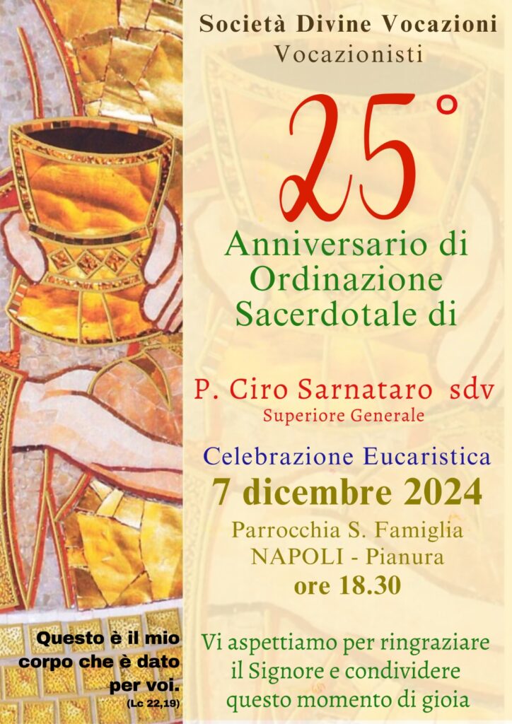 Si è tenuto il 7 Dicembre c.a. presso la parrocchia Santa Famiglia di Pianura ( Il Tempio), retta da Padre Giovanni Mammana sdv, un significativo ed emozionante evento religioso in occasione del 25° Anniversario dell’Ordinazione sacerdotale di Don Ciro Sarnataro, Superiore Generale della Congregazione Vocazionista. Moltissimi i fedeli presenti provenienti anche dall’estero. Molte le autorità civili e militari presenti alla Santa Messa; presenti anche alcuni componenti dell’Associazione Nazionale Carabinieri di Napoli Ovest unitamente ai Volontariato della Protezione Civile dell’Arma dei Carabinieri tra i quali il Consigliere Nazionale dell’Arma dei Carabinieri Giuseppe Simeone, Napolitano Salvatore , Raffaele Di Martino e il Socio Dott. Nicola Baiano; per la Protezione Civile dell’Arma dei Carabinieri era presente il Dott. Fulvio Feo. L’8 Dicembre , festa dell’Immacolata, nella prima mattinata Padre Giovanni Mammana ha deposto, come a il Superiore Generale Don Ciro, ha anche benedetto il presepe realizzato dai volontari della parrocchia Santa Famiglia. Bellissima iniziativa promossa da Padre Giovanni Mammana anche la raccolta dei panettoni donati dai fedeli e destinati alla famiglie bisognose del quartiere oltre a quelle relative ai pranzi comunitari.
