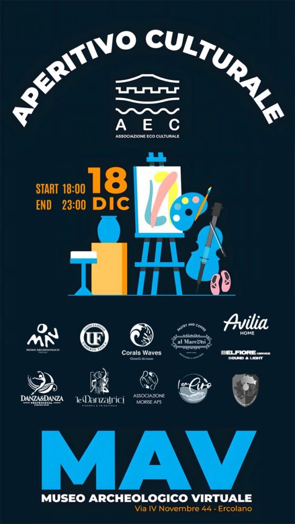 L’idea nasce nel 2020 dall’Associazione Eco Culturale con la volontà di promuovere l’Arte e la Cultura. Un Aperitivo dove ogni Artista, Artigiano (Pittore, Scultore, Fotografo, Musicista, e così via) può MANIFESTARE LIBERAMENTE e in maniera del tutto GRATUITA la propria “IDEA”, così da creare un EVENTO unico nel suo genere ed una RETE di persone unite in un’unica MISSIONE. Il tutto parte dalla scelta della location, e la si struttura come se fosse una vera e propria galleria d’arte. Sarà poi destinata un’area ai musicisti che accompagneranno con le loro note l’intero evento ed infine verrà creata una struttura bar che possa permettere ai visitatori e tutti coloro che interverranno di godere di un buon aperitivo tra SPETTACOLI, ARTE e MUSICA. La Location scelta a questo giro è stata il MAV Museo Archeologico Virtuale della Città di Ercolano dalle 18 alle 23 di mercoledì 18 dicembre, quindi vi aspttiamo in tanti! Il presidente e fondatore dell’Associazione Eco Culturale Davide Tatè che da anni si occupa di questo tipo di eventi sarà lieto di ospitare i visitatore con quello che possa essere una cultura d’inclusione e del buon sano divertimento. Vi attenderà all’evento con tutti i suoi collaboratori e artisti.