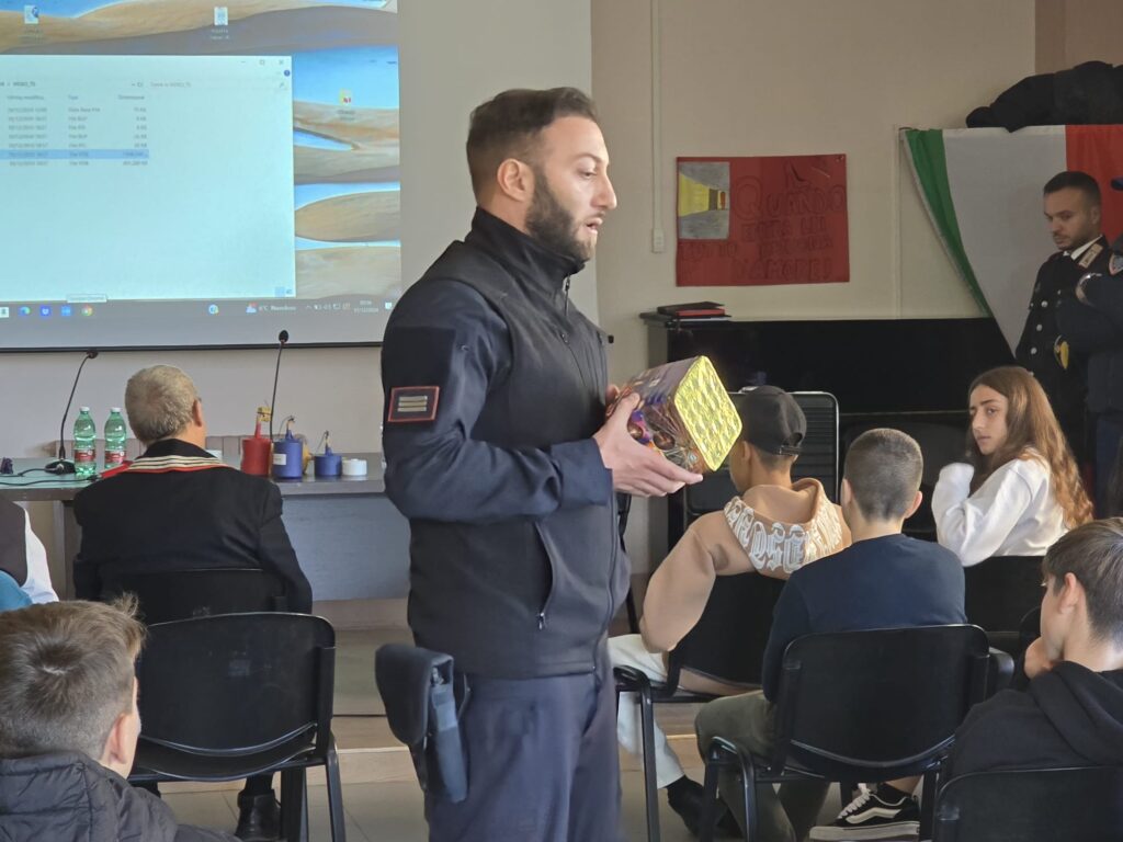 Lodevoli iniziative il 17 Dicembre c.a. presso presso la scuola “G. Falcone” e il 18 Dicembre c.a. presso la Scuola Media Statale Don Giustino Russolillo di via Torricelli con con gli Artificieri dell’Arma dei Carabinieri sul rischio dei fuochi d’artificio e degli ordigni esplosivi. Presenti la Dirigente scolastica della scuola Don Giustino Russolillo, Prof.ssa Mariaroberta Gregorini e la Dirigente scolastica della scuola “Palasciano 72° Circolo“, la Prof.ssa Maria Luisa Salvia. L’interesse tra i discenti di entrambi i plessi è stato notevole. Presente anche la Consigliera della 9^ Municipalità Soccavo Pianura Teresa De Giulio. L’iniziativa è stata promossa dal Presidente dell’associazione Nazionale Carabinieri di Napoli Ovest Nicola Termine, unitamente all’Ingegnere Marco Tartaglia, Coordinatore Provinciale della Protezione Civile dell’Arma dei Carabinieri. Era presente anche il dott. Fulvio Feo, componente della precitata Protezione civile. Inoltre erano un Sottufficiale della Stazione Carabinieri di Napoli Pianura, il Consigliere Nazionale dei Carabinieri di Napoli Ovest Giuseppe Simeone e il Brig. Salvatore Napolitano.