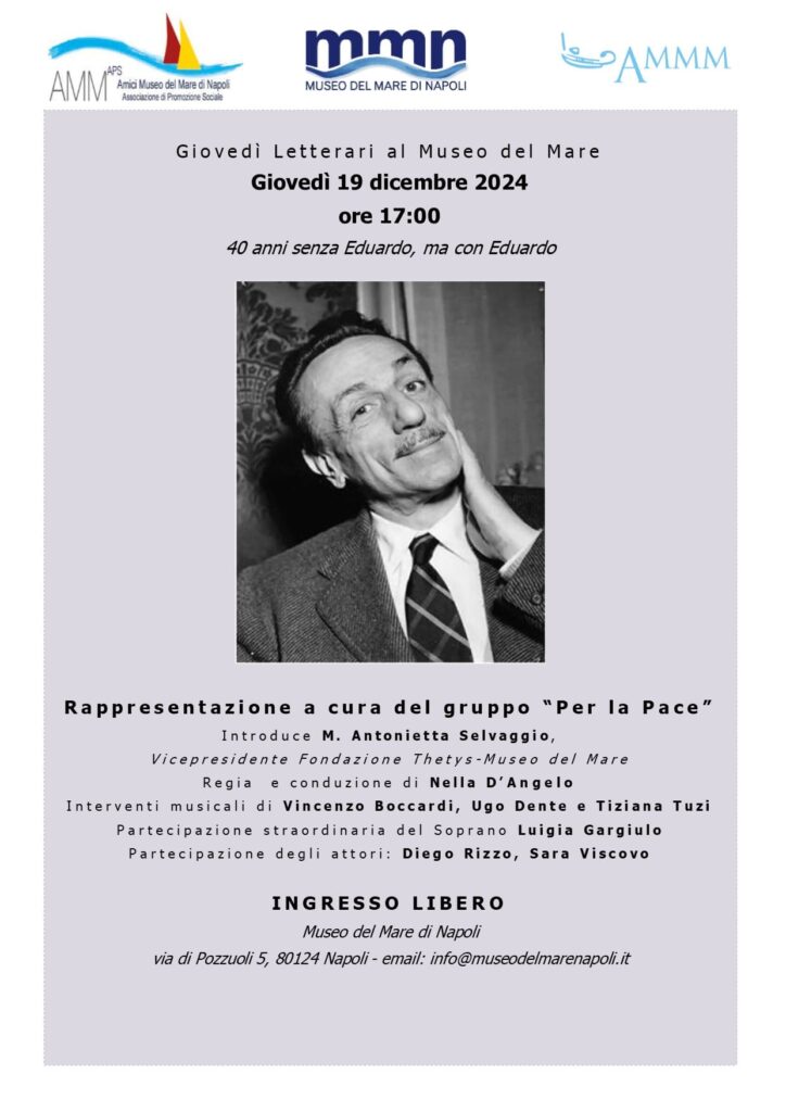 Si è svolto ieri 19 dicembre 2024 , presso il Museo del mare di Napoli la nuova performance del gruppo “ Per la pace “dal titolo “40 anni senza Eduardo, ma con Eduardo “ . Regia di Nella D’angelo e testi di Tiziana Tuzi. Il grande drammaturgo napoletano viene presentato attraverso immagini, e recitazioni di alcune parti delle sue opere teatrali più note, con intermezzi musicali della tradizione popolare napoletana dell ‘800 e ‘900 attraverso l’Interdisciplinarità della comunicazione emotiva che fa ricorso alla lettura, e alle musiche opportunamente selezionate.