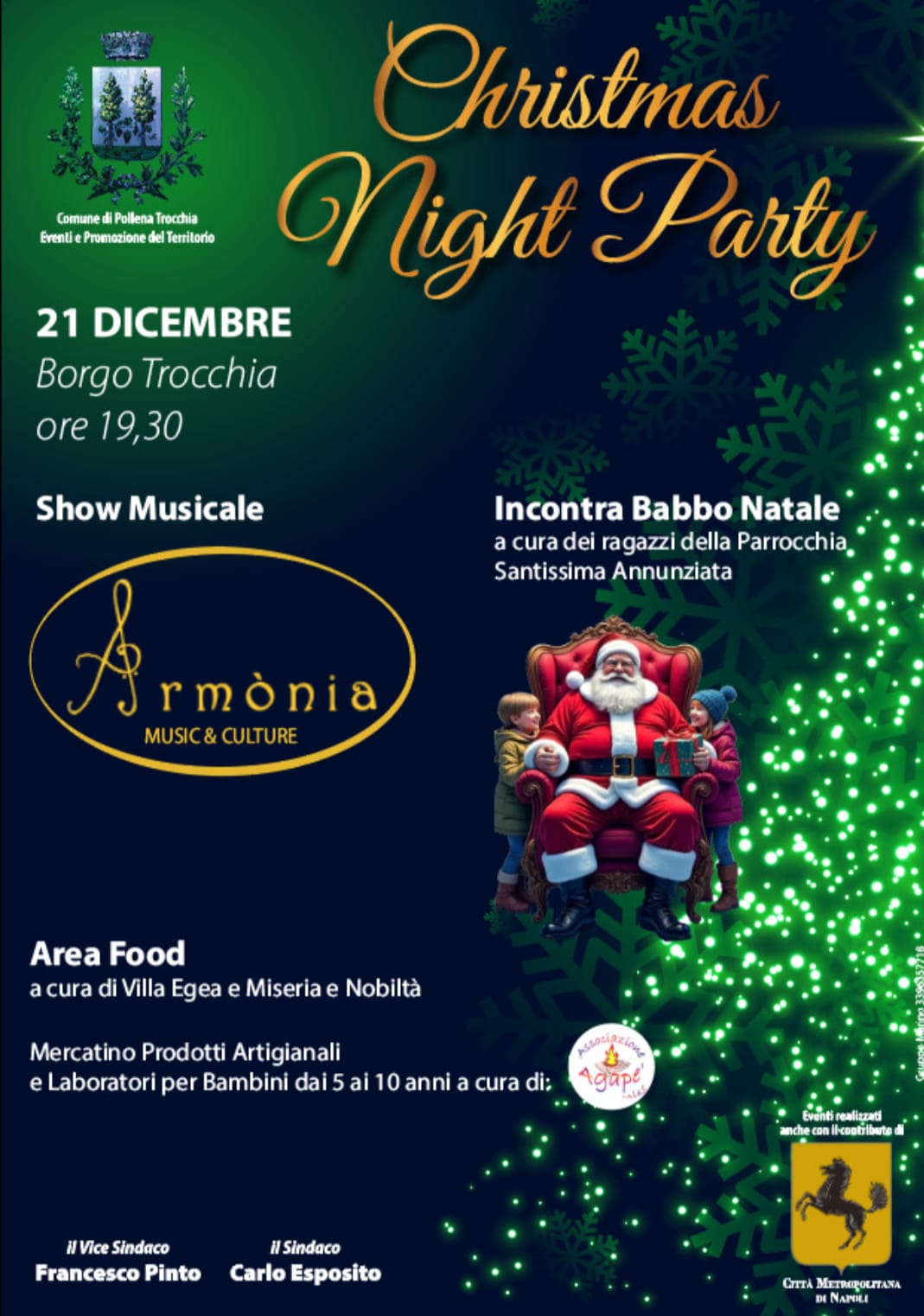 Una vera e propria festa di Natale per le famiglie, che vedrà il borgo di Trocchia animarsi di musica a tema e luci, riempiendosi della magia propria di questo periodo dell’anno e regalando emozioni a grandi e piccini. Domani sera a Pollena Trocchia è in programma un nuovo appuntamento del ricco calendario degli eventi di fine e inizio anno organizzato dall’Amministrazione Comunale. Questa volta sarà Trocchia, e in particolare Piazza Capece Minutolo, via Trinchera e via Caracciolo, a ospitare la manifestazione natalizia. Il Christmas Night Party, questo il titolo dell’evento, prevede lo show musicale a cura di Armonia Music & Culture, che proporrà lo spettacolo Xmas & Dance Under the Star, poi l’incontro con Babbo Natale promosso dei ragazzi della parrocchia Santissima Annunziata e il mercatino di prodotti artigianali con laboratori a tema per bambini dai 5 ai 10 anni curato dall’associazione Agapè. Sarà infine allestita anche un’area food a cura di Villa Egea e Miseria e Nobiltà. «Bambini e bambine, giovani e meno giovani, residenti e non. Tutti sono invitati a vivere la magica atmosfera di una notte di festa natalizia nel borgo di Trocchia, che con musica, luci e allestimenti si farà ancora più accogliente, pronto ad abbracciare chiunque voglia lasciarsi trasportare dalle emozioni e dal divertimento che questo evento promette di sprigionare» ha detto Francesco Pinto, vicesindaco di Pollena Trocchia con delega agli Eventi e alla Valorizzazione del Territorio. «Gli eventi che stiamo realizzando sul territorio comunale sono frutto di un intenso lavoro di programmazione e recupero delle risorse economiche necessarie, provenienti sia da finanziamenti sovracomunali, sia dalle casse del nostro ente. È questo il caso del Christmas Night Party, che sarà ospitato nella nostra cittadina resa ancora più bella dalle luminarie installate per le feste» ha detto il sindaco Carlo Esposito.