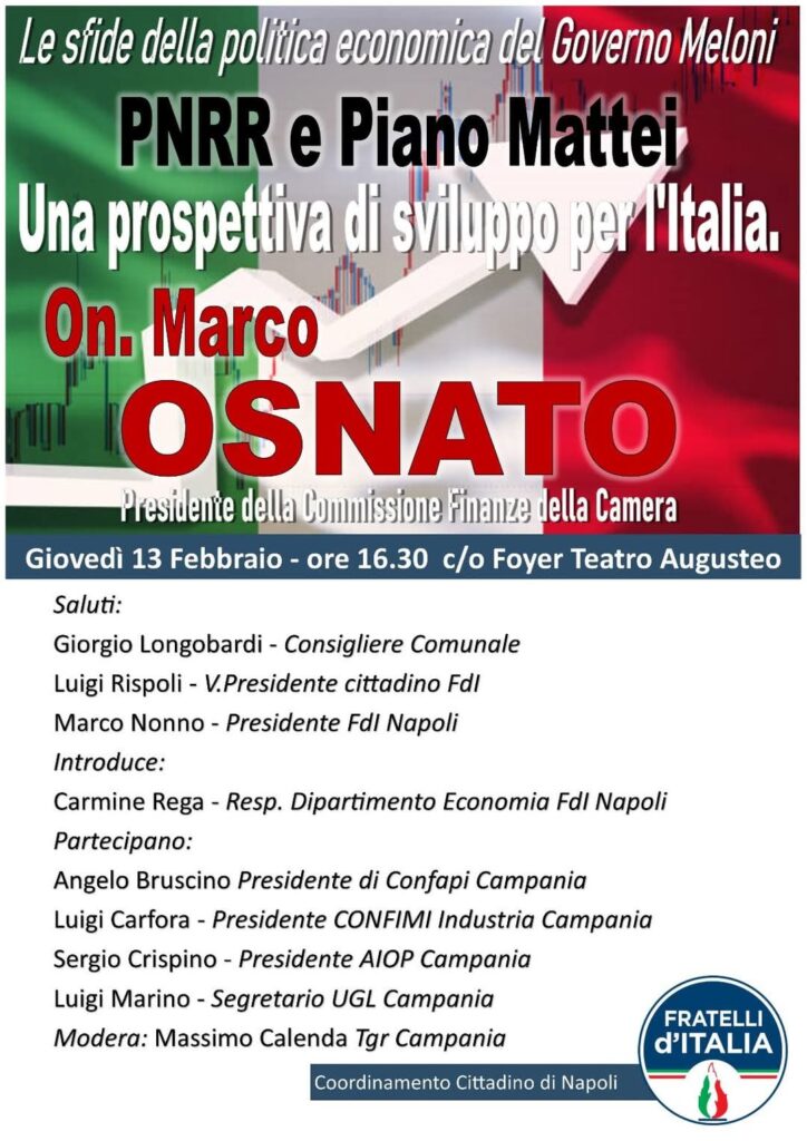 Si è svolto ieri 13 Febbraio c.a. al Teatro Augusteo un interessante e significativo dibattito su PNRR e Piano Mattei promosso dal Coordinamento cittadino di Fratelli d’Italia. Erano presenti, tra gli altri, il Coordinatore cittadino – Napoli di Fratelli d’Italia Marco Nonno, il Vicepresidente cittadino Luigi Rispoli, il Presidente del Gruppo consiliare in Consiglio comunale , Giorgio Longobardi, il quale, nel suo intervento ha evidenziato come Fratelli d’Italia a Napoli, oltre al radicamento ed alla presenza costante sul territorio, stia diventando sempre più attrattiva anche nei temi e nei contenuti proposti alla comunità. Ha concluso i lavori l’On.le Marco Osnato, Presidente della Commissione Finanze della Camera dei Deputati. Nel corso del dibattito sono intervenuti i rappresentanti di varie realtà imprenditoriali ma anche sindacali.