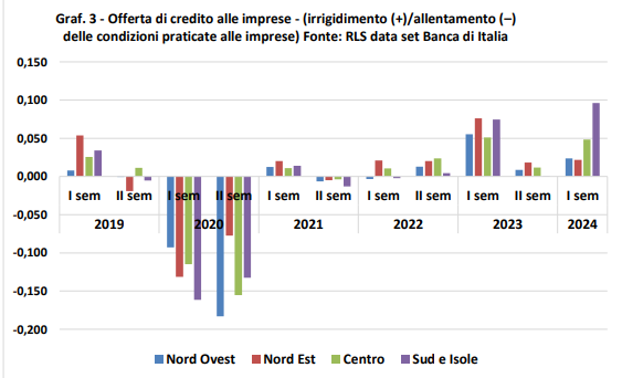 Alla crescita della domanda dei prestiti bancari si contrappongono tuttavia segnali di irrigidimento delle condizioni di offerta del credito bancario superiori nel Mezzogiorno rispetto al Centro Nord (cfr. graf. 3) attraverso la richiesta di maggiori garanzie, l’applicazione di spread più elevati e l’aumento del rating minimo per l’accesso al credito. Secondo il report, queste condizioni sono conseguenti al peggioramento della rischiosità percepita dalle banche nei settori delle costruzioni e manufatturiero mentre nel settore dei servizi all’inverso si registra, all’inverso, un allentamento delle condizioni.