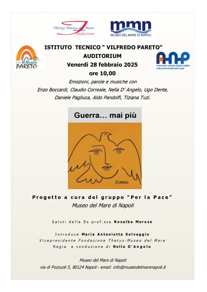 Grande partecipazione, questa mattina, degli alunni e delle alunne dell’istituto “Pareto” di Pozzuoli alla performance del Gruppo Per la Pace del Museo del Mare. Un’intensa giornata che ha visto Emozioni, parole e musiche con Enzo Boccardi, Claudio Correale, Nella D’ Angelo, Ugo Dente, Daniele Pagliuca, Aldo Pandolfi, Tiziana Tuzi,