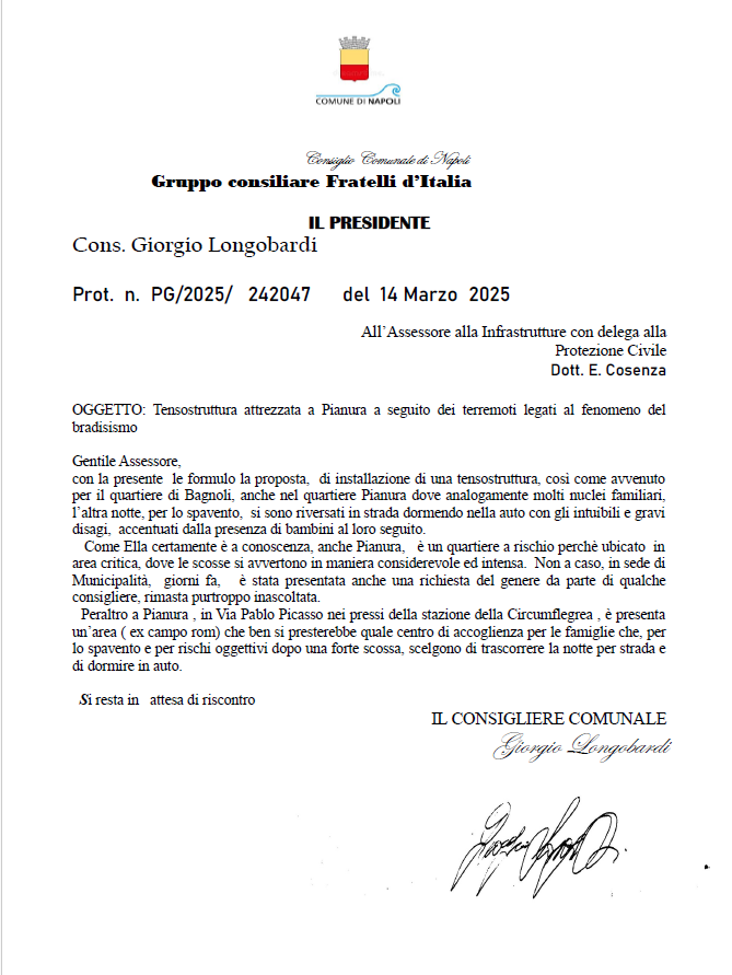 Dopo la scossa di magnitudo 4.4 nella notte del 13 Marzo scorso delle 1,25, numerose e forti sono state le reazioni della popolazioni dei vari quartieri maggiormente interessati al fenomeno, quelli dell’area occidentale vale a dire Bagnoli, Fuorigrotta e Pianura. A Bagnoli, come si ricorderà c’è stata una forte protesta della gente che chiedeva che fosse aperta l’ex base Nato quale area di attesa notturna per i cittadini che avevano scelto di dormire in strada. Finalmente la richiesta è stata accolta con la messa in opera di un centro di Accoglienza ( e non di attesa come ha precisato la Protezione Civile della Regione Campania). Ma anche nel quartiere Pianura , dopo la scossa , molti cittadini sono scesi in strada con bambini al seguito in una nottata alquanto fredda. All’uopo il consigliere della IX Municipalità , Giuseppe Gaetano aveva proposto di montare un tensostruttura con servizi igienici e letti anche a Pianura in Via Pablo Picasso nell’ex campo rom per ospitare le famiglie con bambini ( e non) dove trascorrere la notte. << La mia proposta – ha affermato il consigliere Gaetano è rimasta inascoltata – e questo non mi sembra affatto giusto tenuto conto che anche Pianura è zona a medio rischio>>. Al proposito il consigliere comunale Giorgio Longobardi , nel recepire le legittime lagnanze del consigliere della IX Municipalità , Gaetano , ha inteso inviare una formale nota all’Assessore alla Protezione Civile ( vedi foto) affinchè anche nel quartiere Pianura possa essere allestita una tensostruttura analogamente a quanto realizzato a Bagnoli tenuto conto che l’area individuata in Via Pablo Picasso , nei pressi della stazione Circumflegrea, potrebbe prestarsi in via temporanea a centro di accoglienza.