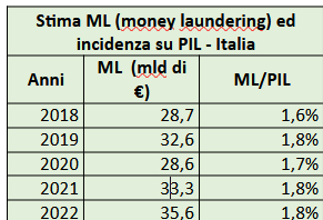 La Unità di Informazione Finanziaria (UIF) della Banca di Italia ha pubblicato lo scorso 25 gennaio Lo studio The size of money laundering and other illicit financial conduct for Italy recante stime aggiornate per gli anni 2019-2023 sul valore del riciclaggio dei capitali finanziari in Italia e nelle singole regioni italiane. Le valutazioni annuali del riciclaggio dei fondi illeciti (money laundering) in Italia crescono dai 28,7 miliardi di euro del 2018 ai 35,6 miliardi del 2022 con la sola eccezione della flessione del 2020, anno di contrazione delle attività economiche per la pandemia, quando i capitali ‘ripuliti’ si riducono a 28,6 mld di euro. Il dato interessante è l’incidenza dell’aggregato sul PIL italiano che, mediamente, nel periodo si attesta stabilmente intorno all’1,8%. Il riciclaggio di proventi illeciti, quindi, si presenta come fenomeno pro-ciclico cioè un fenomeno che cresce quando il PIL aumenta nelle fasi di espansione delle attività produttive e si riduce nelle fasi di crisi quanto il PIL si contrae.