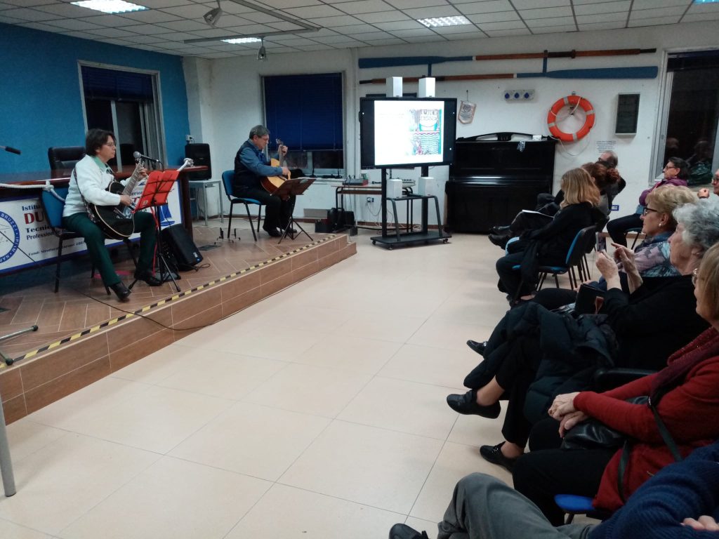 Il prof. Vincenzo Boccardi ha col suo mandolino accompagnato il canto di Tiziana Tuzi : autrice tra l’altro di una dolcissima poesia dedicata alla pace, e che, con la sua chitarra ha offerto al pubblico una sua recente composizione musicale dedicata ai giovani con il brano “ Il domani Zen”.