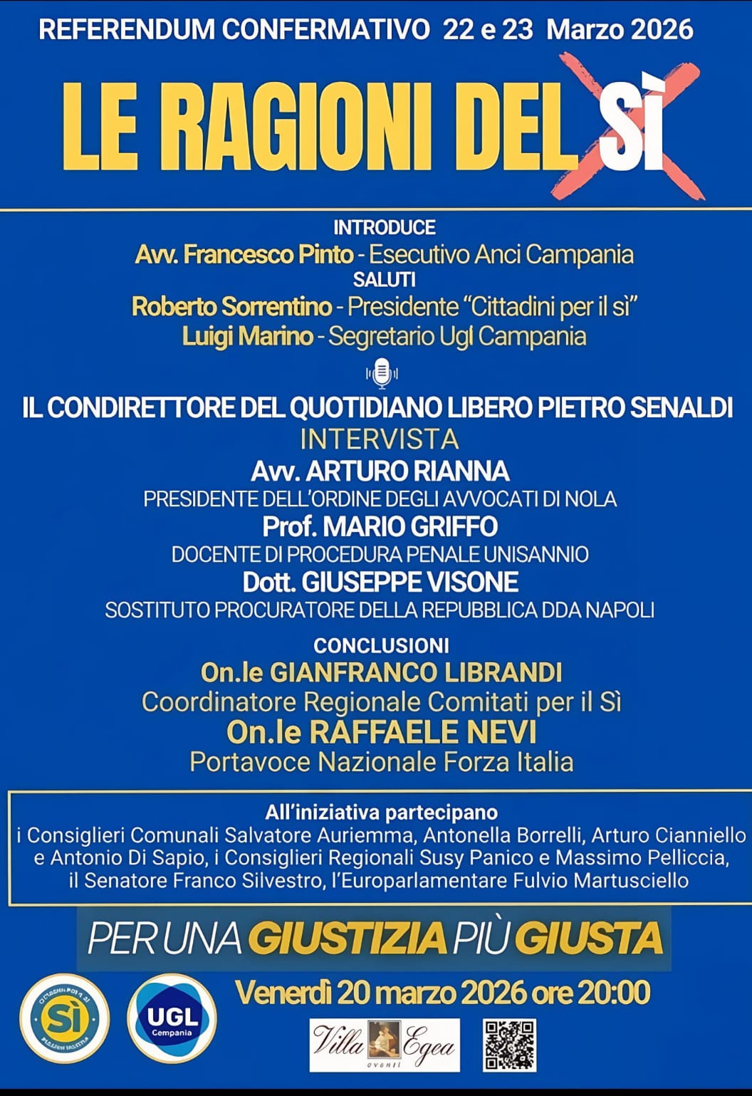 Si chiude con quel tocco di esperienza, professionalità e qualità. Tante saranno le personalità presenti, dello scenario politico e non che daranno spiegazioni sul perché scegliere di votare quel “SI PER UNA GUISTIZIA PIÙ GIUSTA”. Portavoce, docenti e dottori tutti uniti x quello che è un referendum confermativo.